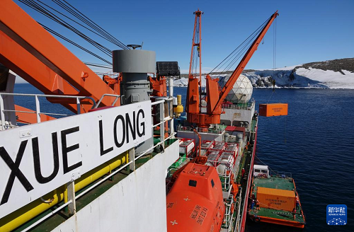 12月29日,“雪龙”号极地科考破冰船在秦岭站海域开展驳船卸货作业。(新华社记者 顾天成 摄)