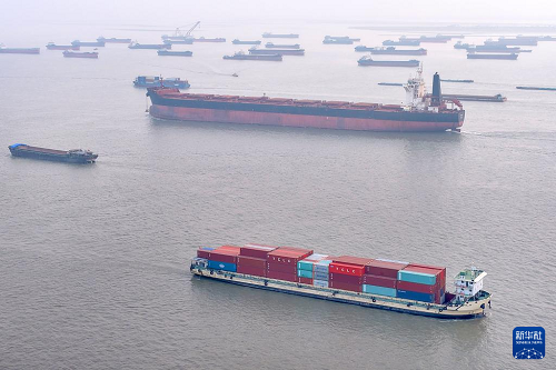众多货船行驶在长江江苏南通段江面上(11月5日摄,无人机照片)。(新华社发 许丛军 摄)