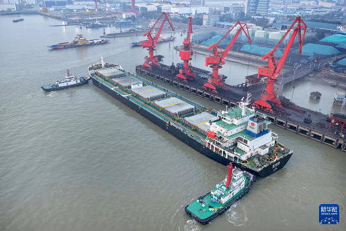 12月29日,南通港一处码头准备卸运电煤(无人机照片)。(新华社发 许丛军 摄)
