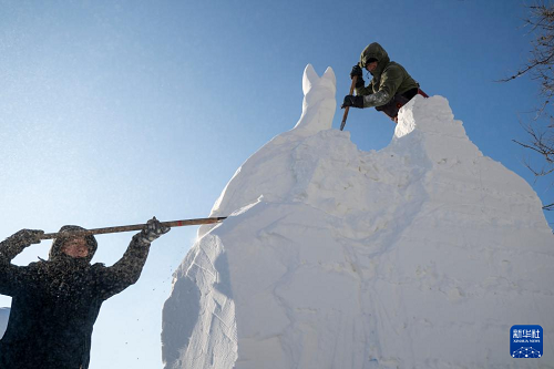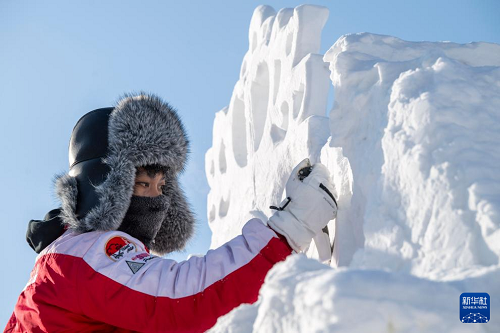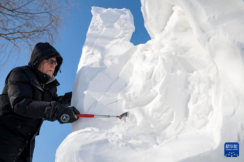 1月7日,在哈尔滨太阳岛雪博会园区,来自13个国家的25支代表队百余位艺术家在寒冬中坚持艺术创作,精雕细琢雪雕作品。