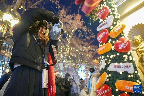1月8日,游客在哈尔滨中央大街游玩拍照。(新华社记者 王建威 摄)