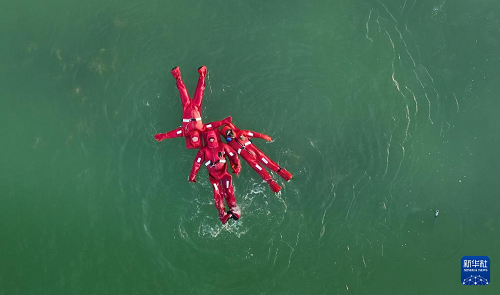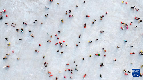 1月17日,市民在银川文旅集团览山公园体验“冰浮小龙虾”特色项目(无人机照片)。(新华社记者 王鹏 摄)