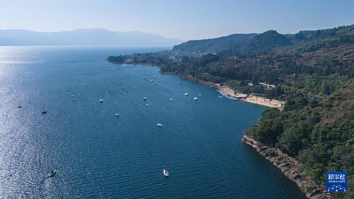 1月27日在云南省玉溪市拍摄的抚仙湖一景(无人机照片)。(新华社记者 高咏薇 摄)