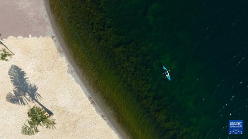 1月27日,游客在云南省玉溪市抚仙湖划船游玩(无人机照片)。(新华社记者 高咏薇 摄)