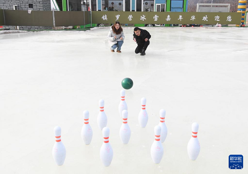 1月28日,在北京市平谷区镇罗营镇湖畔耕读园,游客在活动现场体验“冰上保龄球”。(新华社记者 任超 摄)