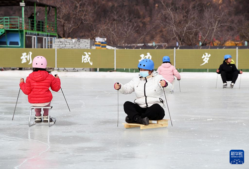 1月28日,在北京市平谷区镇罗营镇湖畔耕读园,游客在活动现场滑冰车。(新华社记者 任超 摄)