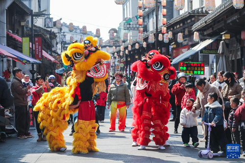 2月8日,游客在寿昌古镇老街上观看传统舞狮表演。(新华社记者 徐昱 摄)