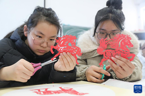 2月8日,河南省焦作市温县的学生在一家培训班学习制作“马”剪纸作品。(新华社发 徐宏星 摄)