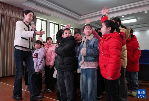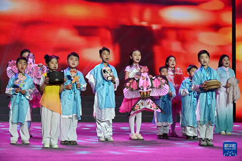 2月8日,在河南省沁阳市朱载堉音乐厅,小朋友们在“少儿春晚”上表演集体诗朗诵《非遗里的中国》。(新华社发 杨帆 摄)