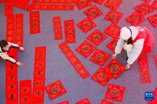 2月8日,学生志愿者(右)在江苏省海安市政协书画联谊会送福字、赠春联文化惠民活动现场整理书法作品。(新华社发 顾彬斌 摄)