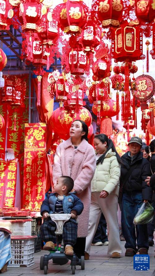 2月11日,家长带着孩子在贵州省都匀市年画市场选购春节饰品。(新华社发 肖伟 摄)