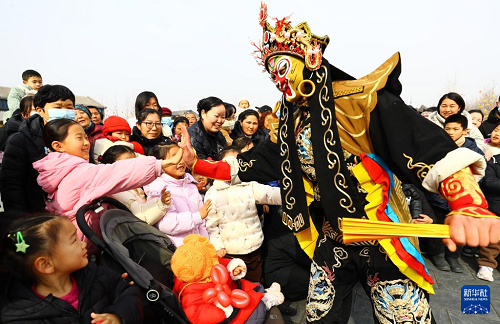2月10日,在河南省周口市川汇区关帝庙广场,进行表演的民间艺人与观众互动。(新华社发 高建中 摄)
