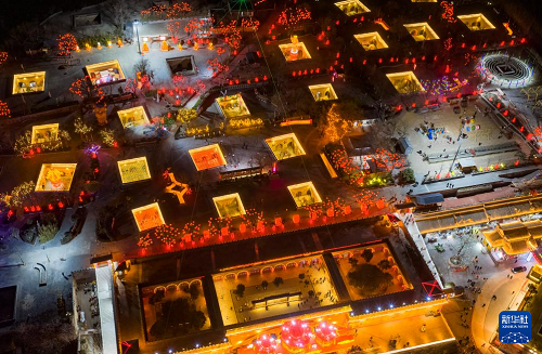 2月10日,人们在河南省三门峡市陕州区地坑院景区欣赏花灯(无人机照片)。(新华社发 孙猛 摄)