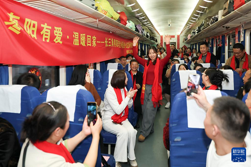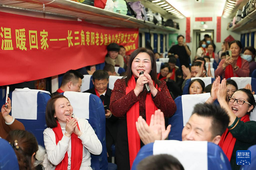 2月11日,枣阳籍务工人员在K1127次列车上自编自演节目。(新华社记者 王翔 摄)