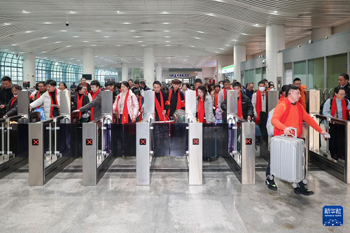2月11日,枣阳籍务工团体在上海站优先检票进站。(新华社记者 王翔 摄)