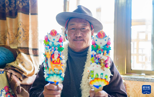 2月12日,在拉萨市林廓东路,来自西藏日喀则市仁布县普松乡的手工艺人罗布展示做好的酥油花。(新华社记者 丁增尼达 摄)