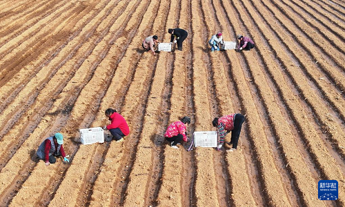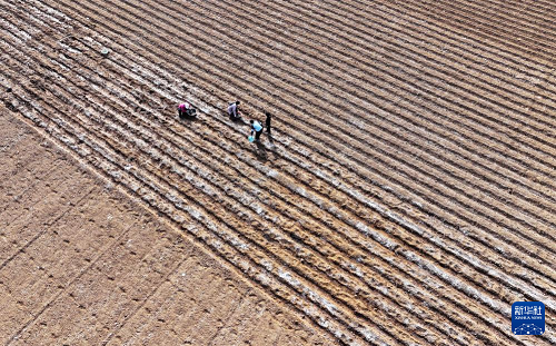 2月13日,在山东省枣庄市山亭区桑村镇,农民在播种马铃薯(无人机照片)。(新华社发 李宗宪 摄)