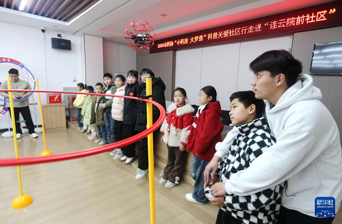 2月12日,在江苏省连云港市连云区墟沟街道院前社区爱心托班,科普志愿者教小朋友操作无人机。(新华社发 王春 摄)