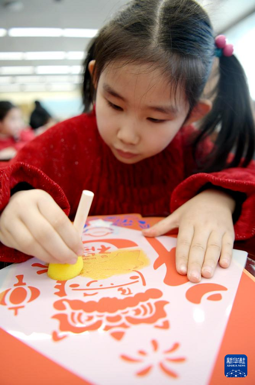 2月11日,在河南省鹤壁市图书馆,一名小朋友制作手工拓印作品。(新华社发 赵永强 摄)
