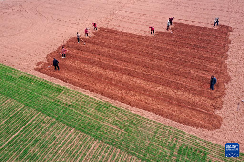 2月25日,河南省沁阳市王曲乡东王曲村,农民在田间整地作畦(无人机照片)。(新华社发 杨帆 摄)