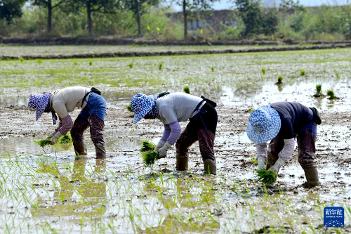 2月23日,云南省西双版纳州勐海县勐遮镇曼拉村的村民在稻田里插秧。(新华社发 佐连江 摄)