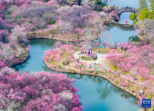 2月25日,游客在江苏扬州瘦西湖风景区赏梅游玩(无人机照片)。(新华社发 周社根 摄)