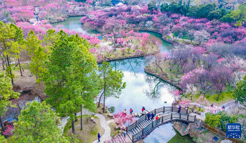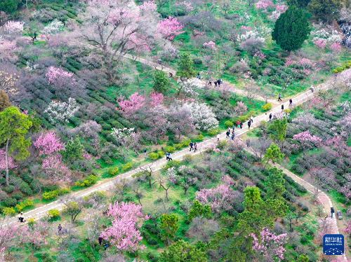 2月25日,游客在江苏南京明孝陵梅花山上赏梅踏春(无人机照片)。(新华社发 杨素平 摄)