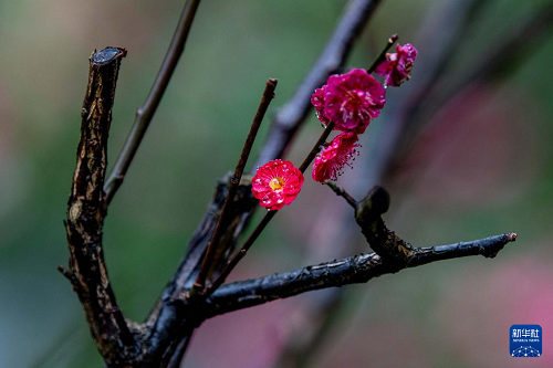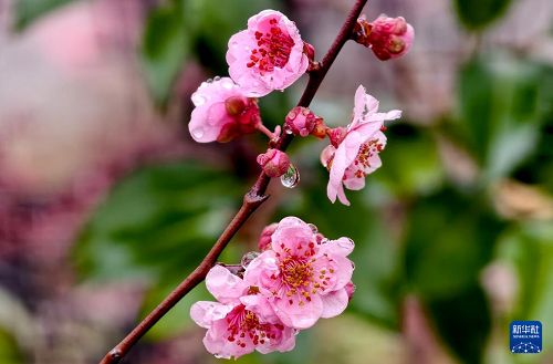 这是3月1日在河南省洛阳市街头拍摄的雨后梅花。(新华社发 高山岳 摄)