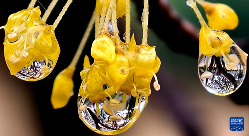 这是3月1日拍摄的河南省洛阳市街头花朵上的雨珠。(新华社发 高山岳 摄)