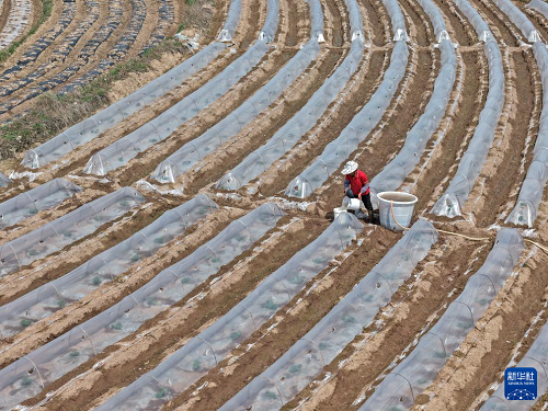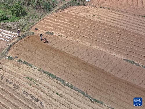 3月1日,村民在广西南宁市邕宁区蒲庙镇田园里耕作(无人机照片)。(新华社记者 周华 摄)