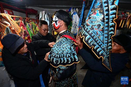 3月2日凌晨,陇县黄花峪村村民为社火队队员穿戴演出服饰。(新华社记者 邹竞一 摄)