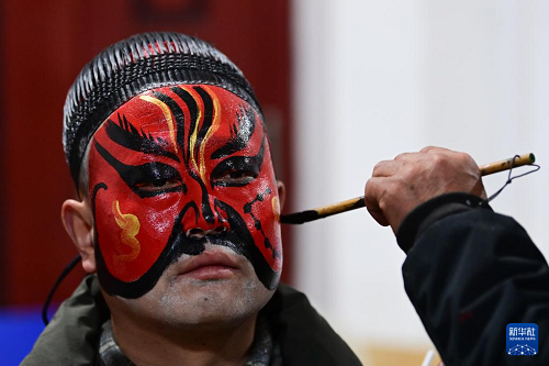 3月2日凌晨,老艺人为陇县黄花峪村社火队队员绘制社火脸谱。(新华社记者 邹竞一 摄)