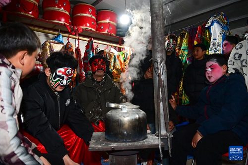 3月2日,陇县黄花峪村社火队队员在相互交流。(新华社记者 邹竞一 摄)