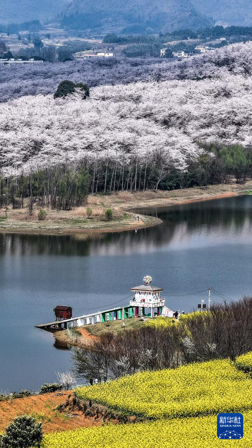 近日,随着气温回升,贵州省贵安新区樱花园内的2.4万亩樱花迎来盛花期。如云似霞的樱花和山川、湖泊、民居构成一幅幅美丽的春日画卷,吸引众多游客前来观光游玩。