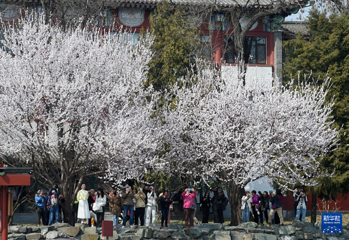 3月16日,游客在北京北海公园拍摄照片。(新华社记者 罗晓光 摄)