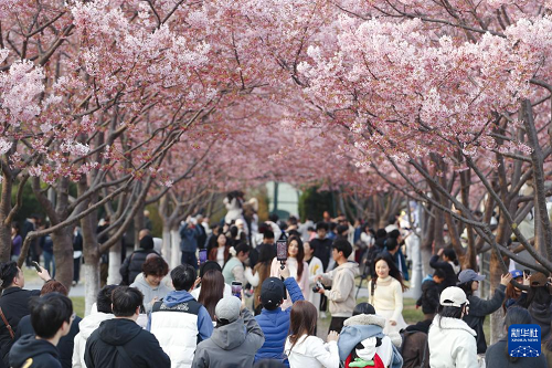 3月16日,人们在浙江省宁波市鄞州区文化广场观赏盛开的樱花。(新华社发 胡嘉捷 摄)