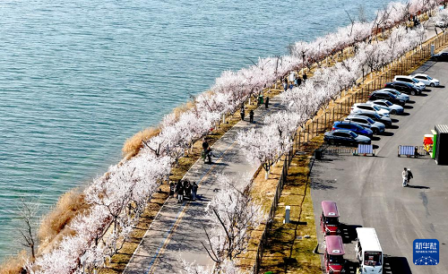 3月16日,游客在河北省石家庄市滹沱河畔赏花游玩(无人机照片)。(新华社发 陈其保 摄)