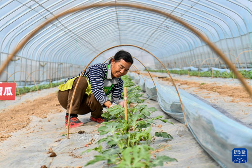 3月18日,山西省运城市夏县夏乐精品瓜业合作社的工作人员在管护西瓜苗。(新华社记者 曹阳 摄)