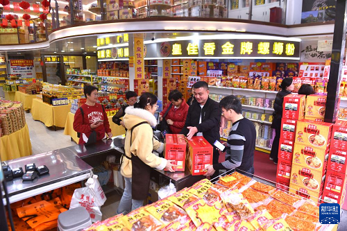在广西柳州市青云民生市场一家特产超市,游客在选购螺蛳粉(2026年3月10日摄)。(新华社记者 黄孝邦 摄)