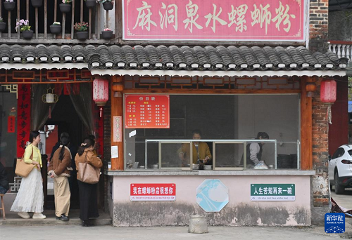 游客在广西融水苗族自治县融水镇新国村一家螺蛳粉店排队购买螺蛳粉(2026年3月7日摄)。(新华社记者 黄孝邦 摄)