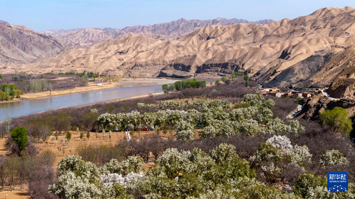 春日的宁夏中卫市南长滩村,黄河水蜿蜒流淌,岸边绿芽初绽,村里梨花竞相开放,勾勒出一幅生机盎然的黄河春景图。
