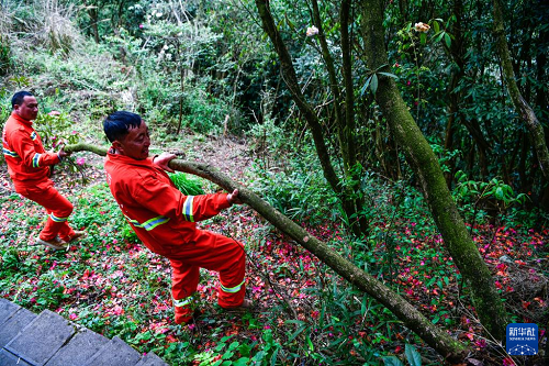 在贵州百里杜鹃管理区金坡景区,森林防火队员们在巡逻途中清理一棵倒伏的杜鹃树(4月2日摄)。(新华社记者 杨文斌 摄)
