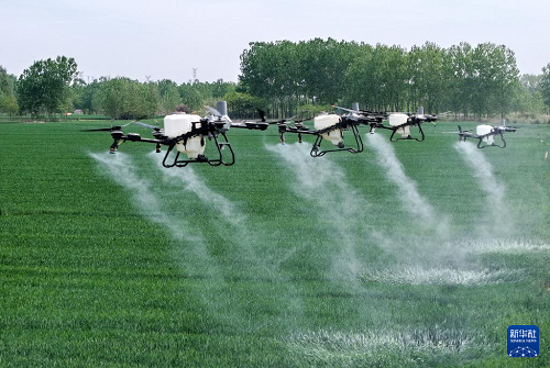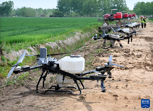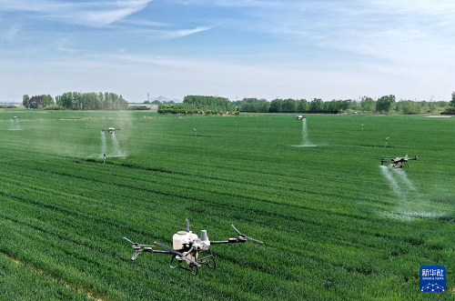 4月28日,在青岛市西海岸新区大场镇绿色增粮先行区,植保无人机准备开展“一喷三防”作业。(新华社记者 李紫恒 摄)
