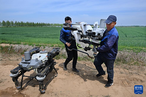 4月28日,在青岛市西海岸新区大场镇绿色增粮先行区,工作人员在搬运植保无人机。(新华社记者 李紫恒 摄)