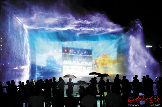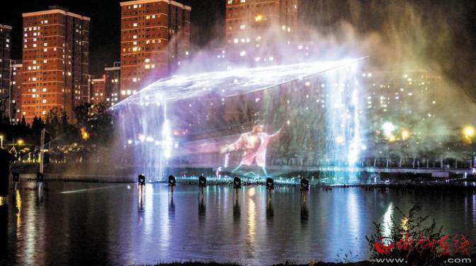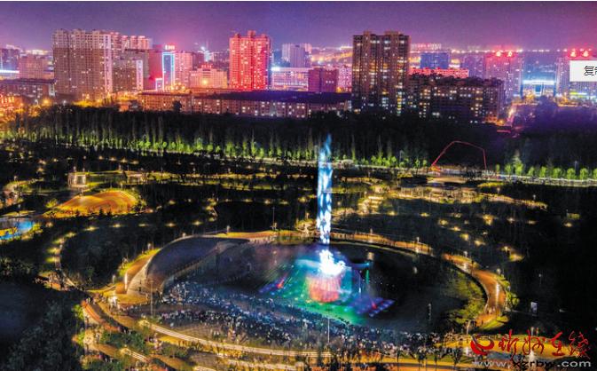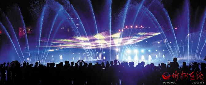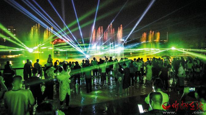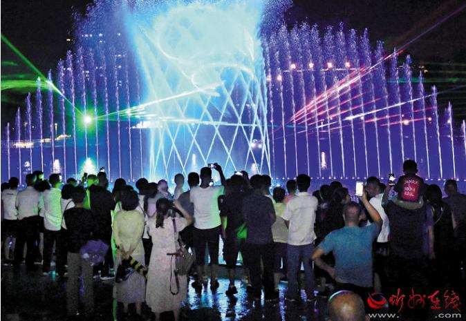 公园在注重园林、景观建设的同时,突出主题文化内涵的展现,湖水喷泉、观赏果园、主题植物园、阶梯花台等特色园林具有观赏性,园内还配套建有遗山文化馆、张拉膜广场、健舞剧场、休闲茶吧、咖啡馆等群众休闲活动场所,是又一惠及民生的心灵家园。图为8月1日晚,市民在遗山公园喷泉广场观赏绚丽多彩的喷泉灯光秀。刘纪森 智芝龙 白晓明 胡 炜 摄