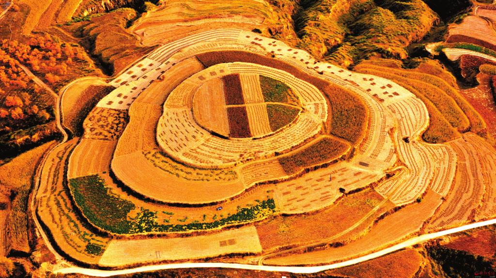 层层梯田满目金黄,极目远眺宛如画卷。河曲县乡村错落有致的梯田与曲折的道路相呼应,绘出一幅别致的田园风光画。(何 帅 杨成林摄)