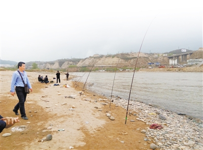 当日下午3时许,兰州晨报记者在雁白大桥西侧的黄河岸边看到12把鱼竿一字排开,3名钓鱼者坐在旁边沙滩上正在等待鱼儿上钩,还有两名中年男子正在周围撒网。在相隔十多米处,记者发现还有两名男子分别撑着鱼竿钓鱼,有一名捕鱼者在撒网。“这是双面粘渔网,河内稍大一些的鱼儿只要撞进网里就摆脱不了。”一名捕鱼男子得意地说。