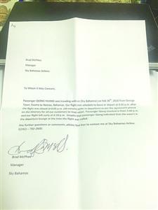 SkyBahamas航空公司给黄小姐开了一张情况说明,称飞机确实早于18点45分起飞。