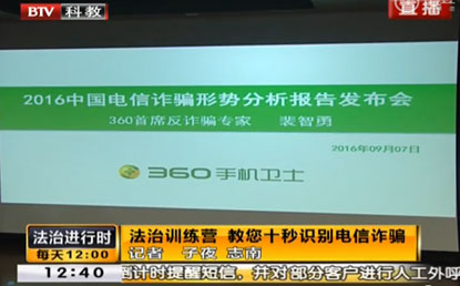 中国经济网北京9月12讯 生活中,当你接到诈骗电话的时候,你要多久能发现这个骗局呢,10秒?20秒?还是根本识别不出来?9月10日,北京卫视《法治进行时》栏目在节目一开始便抛出了这样一个问题。面对电信诈骗分子日益多变的手法,如何头脑清晰地最快识别出骗局?这一期的《法治进行时》和360手机卫士专家一起给大家提供了很多实用的建议。