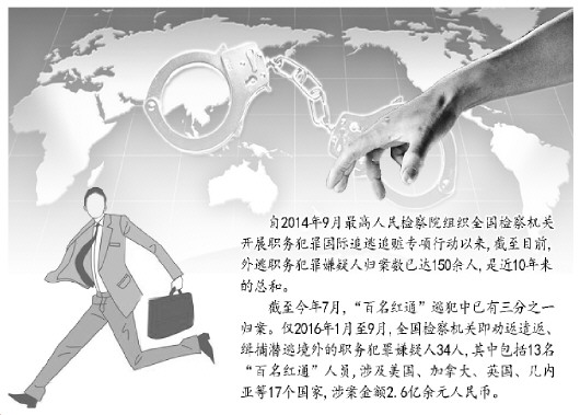 据了解,截至今年7月,“百名红通”逃犯中已有三分之一归案。仅2016年1月至9月,全国检察机关即劝返遣返、缉捕潜逃境外的职务犯罪嫌疑人34人,其中包括裴健强、陈祎娟、付耀波、周世勤等13名“百名红通”人员,涉及美国、加拿大、英国、几内亚等17个国家,涉案金额2.6亿余元人民币。
